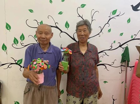 最后老人们贴上五颜六色形状不同的纽扣,手中平凡无奇的玻璃瓶在被粉饰之后,纷纷摇身变成了简约且清新风格的装饰品,创意十足,大家都玩的不亦乐乎。