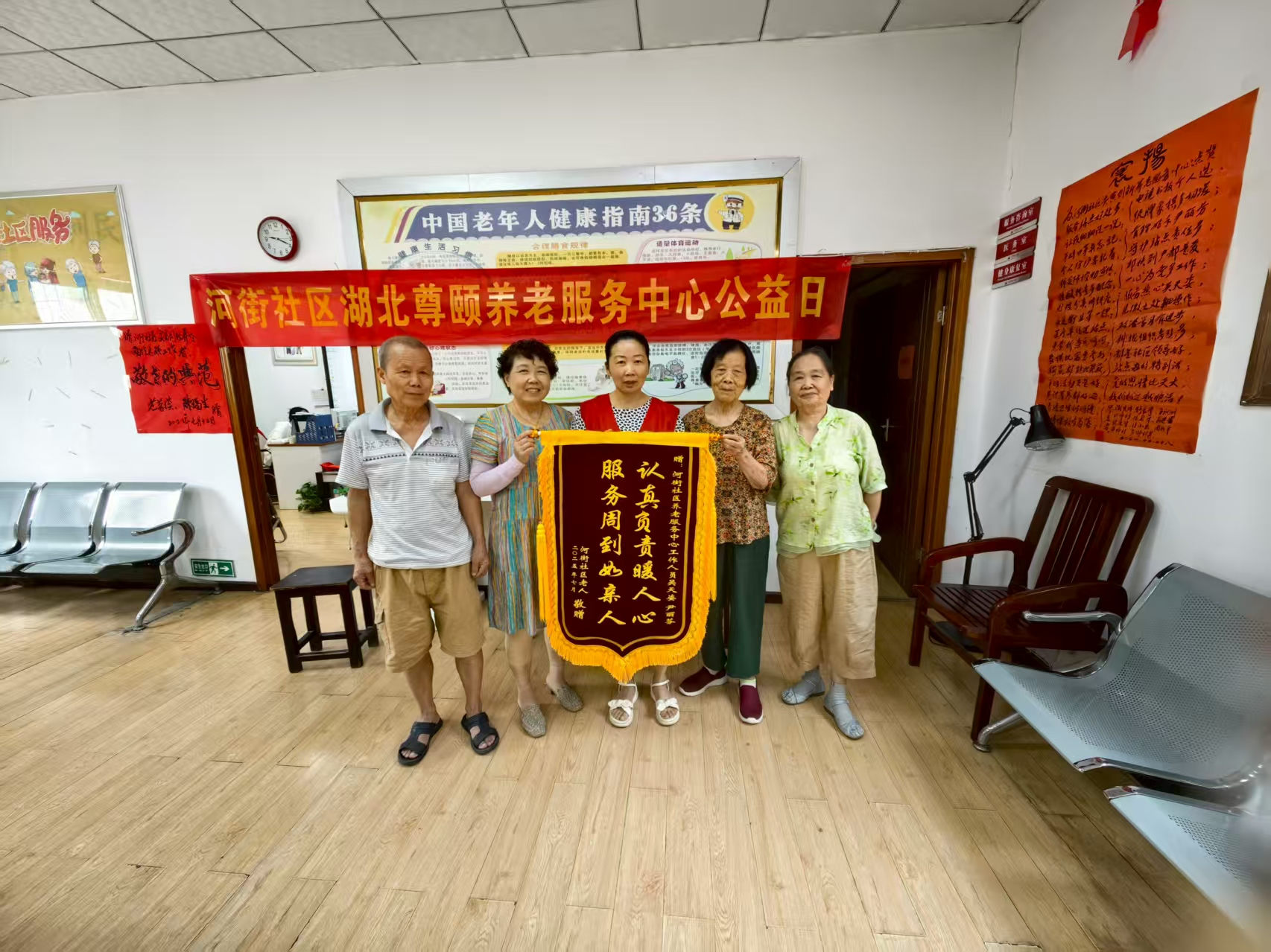 近日,蔡甸街道河街社区冯大爷、肖婆婆、张婆婆、郭婆婆和丁婆婆将一面写着“服务周到如亲人,认真负责暖人心”的锦旗送到社区居家养老服务中心,对社区养老服务中心的细致关怀和专业化服务表达诚挚谢意。