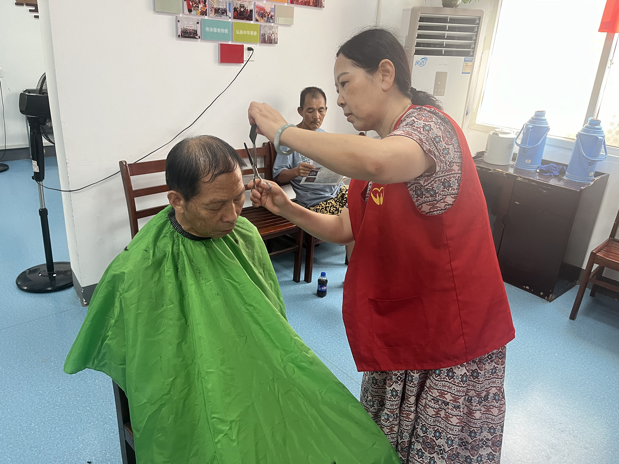 伴随着剪刀“咔嚓、咔嚓”的清脆响声,老人们原本凌乱的头发变得整齐利落,“理发师”们精湛娴熟的手艺和热情周到的服务让老人纷纷竖起了大拇指。一推一剪皆是情,点点滴滴暖人心。“天气这么热,还能在家门口理上发,真是太方便了!”刚理完发的张奶奶笑着说道。