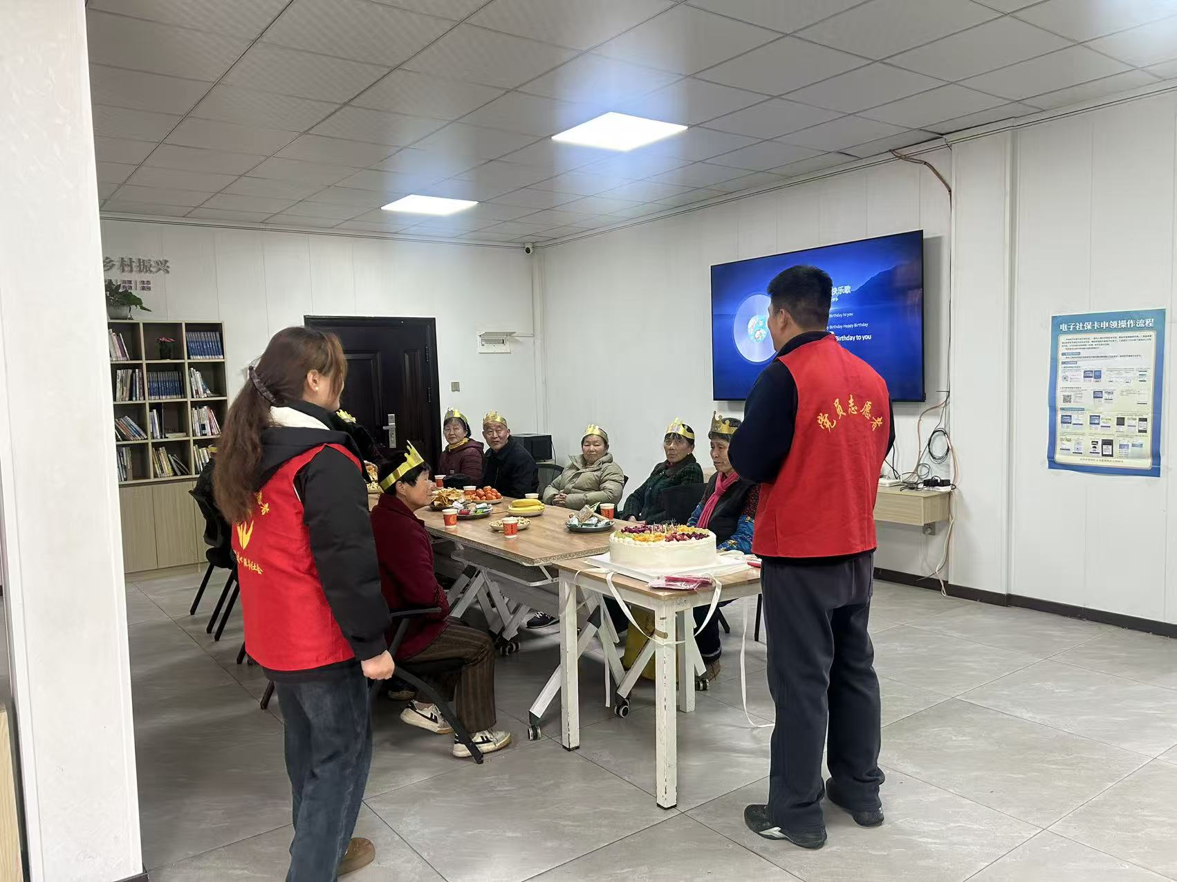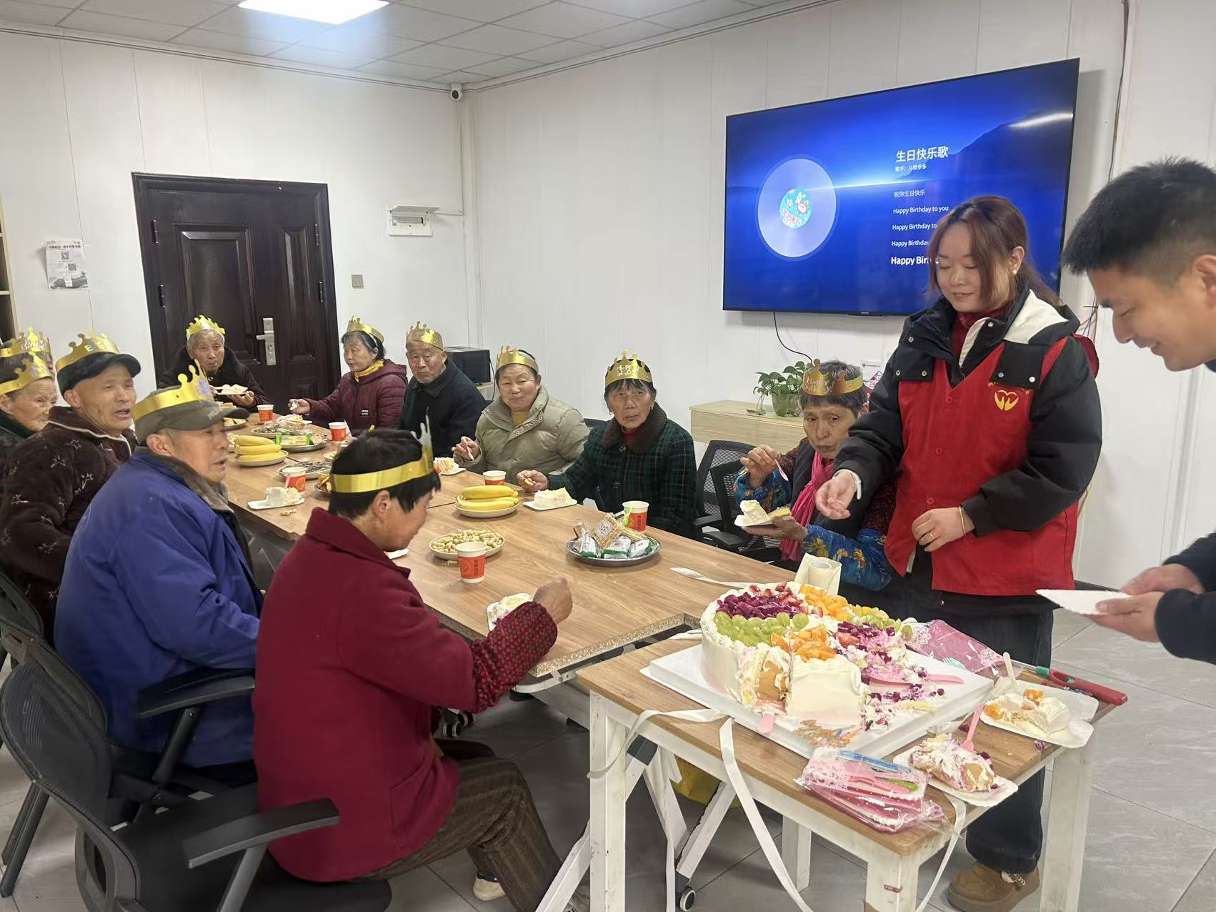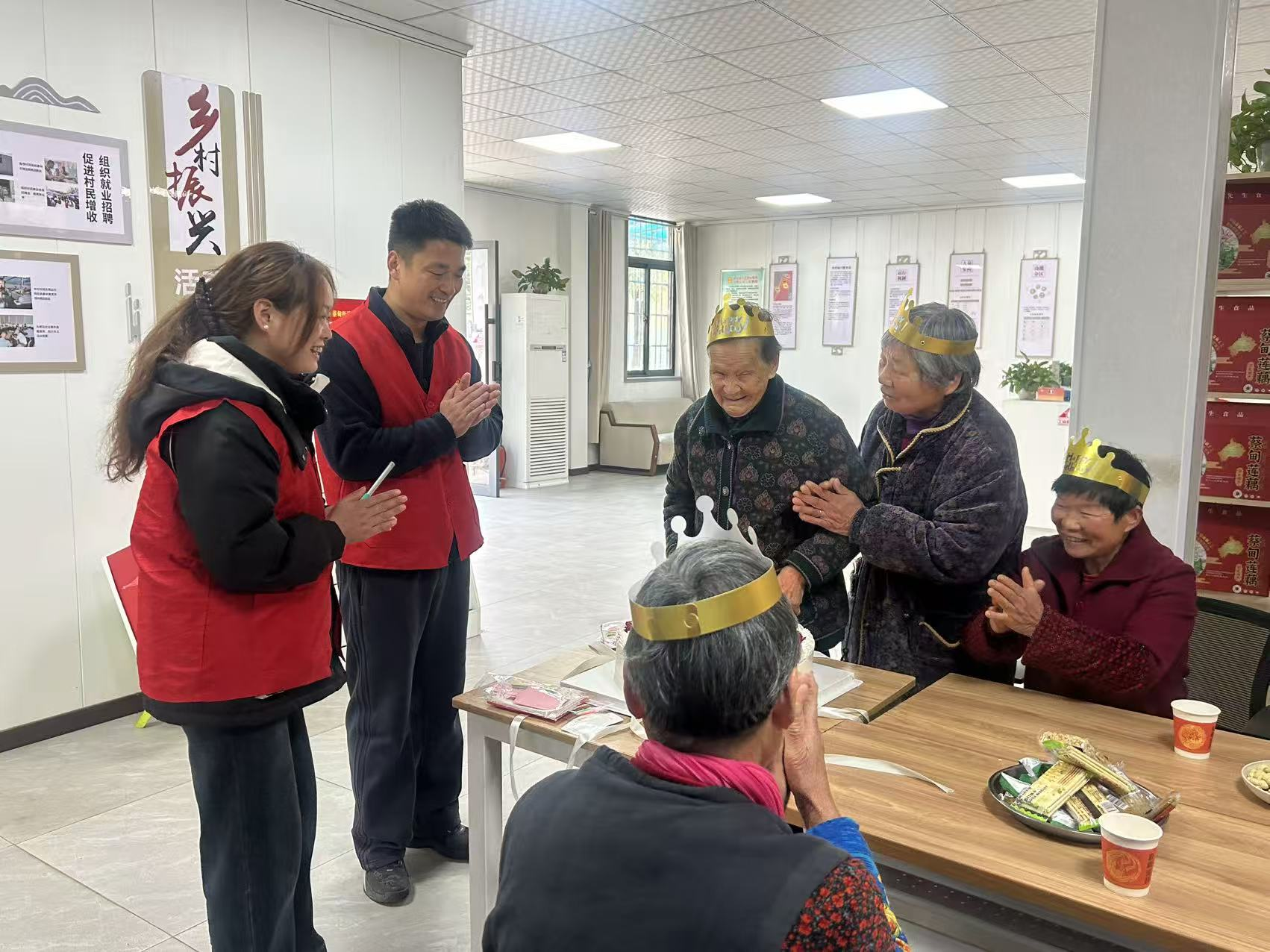 活动当天,党员志愿者们提前抵达现场,精心布置起温馨雅致的会场:鲜艳的气球点缀其间,暖心的祝福语张贴四周,桌上整齐摆放着香甜的水果与定制生日蛋糕。伴随着悠扬的《生日快乐歌》,党员志愿者为老人们逐一戴上精致的生日皇冠,邀请村内96岁高龄的李婆婆作为代表,带领全体寿星共同吹灭蜡烛,现场响起阵阵热烈掌声。