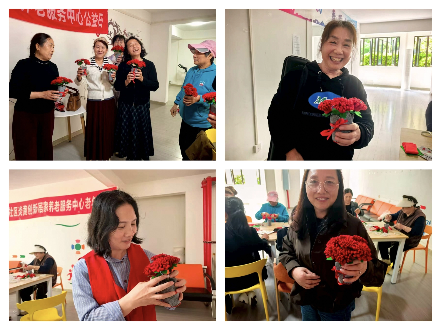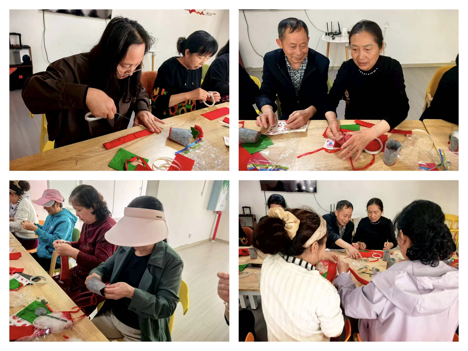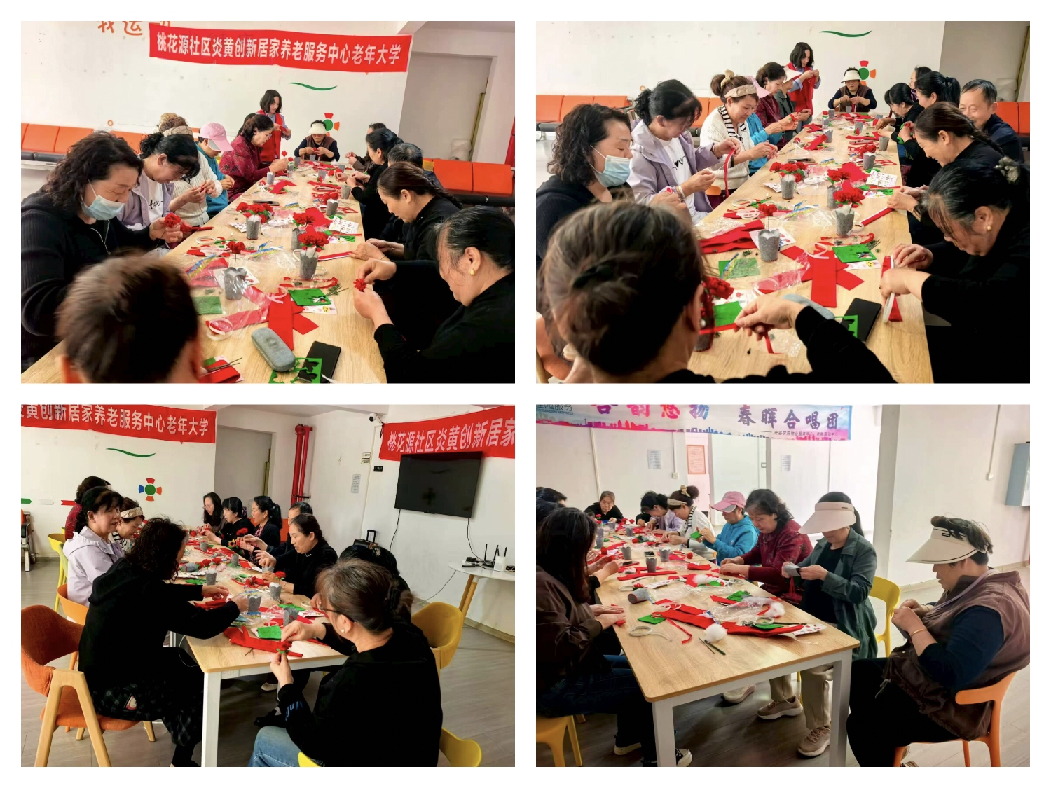 活动现场暖意融融、氛围热烈。老年朋友们兴致高涨、全神贯注,紧跟老师步骤认真创作。邻里之间相互交流、互帮互助,遇难题时虚心请教,有成果时开心分享,普通的布艺材料在一双双巧手下,逐渐化作栩栩如生、色彩明艳的玫瑰、康乃馨与向日葵。大家边制作边唠家常,在轻松愉悦的氛围中,既锻炼了手部灵活性与思维能力,又增进了邻里情谊,现场欢声笑语不断,处处洋溢着幸福与温馨。